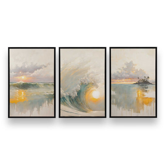 Golden Waves at Sunset, Set of 3 Prints on Canvas