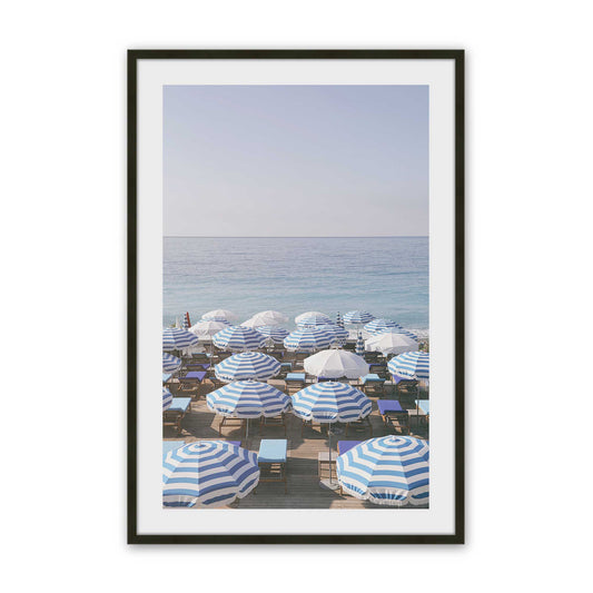 Blue Umbrellas by the Shore Print